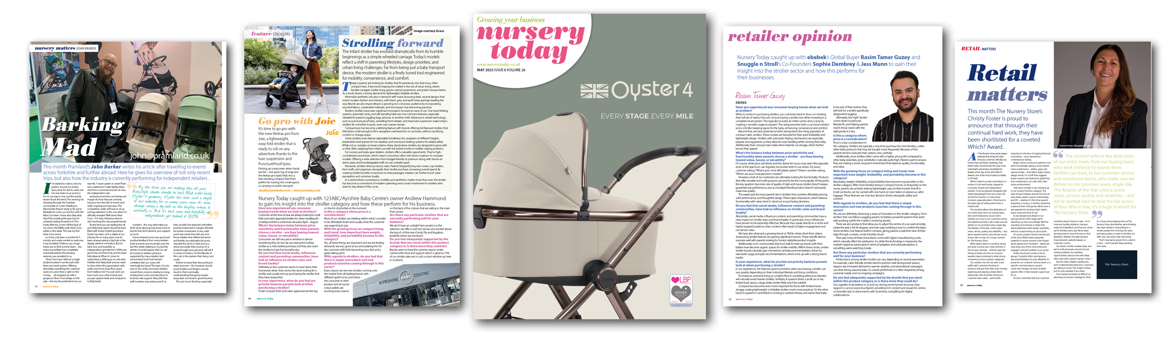 IN OUR RETAIL SECTION: Nursery Today had the pleasure to catching up with 123ABC, ebebek and Snuggle & Stroll to gain their thoughts on the Stroller sector with ebebek’s Global Buyer Rasim Tamer Guzey telling Nursery Today that for them their customer’s main priority when making their purchasing decision is weight, foldability, and portability. “With more families living in compact homes or frequently on the move, parents are actively seeking lightweight, easy-to-fold models that fit in small car boots, can be carried with one hand, or even taken on planes as cabin luggage.” Said Rasim. “These features are now key decision drivers alongside safety and comfort.” Find out more simply by turning to page 14.