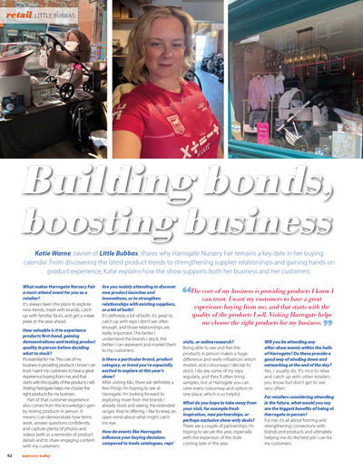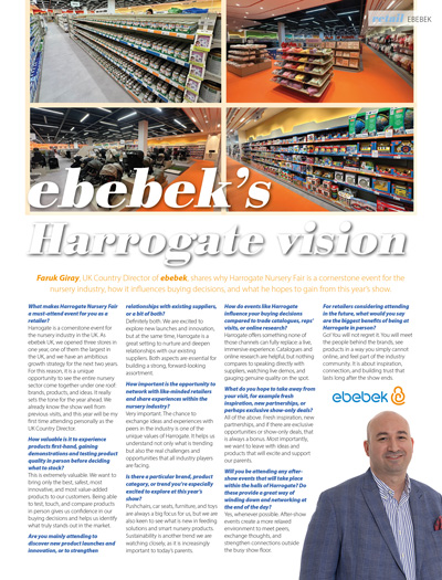 IN OUR RETAIL SECTION: With Harrogate on the horizon Nursery Today caught up with Independent Nursery Retailers Jolly Tots (page 38), Little Bubbas (page 62) and ebebek (page 67) to gain their thoughts on why Harrogate is firmly in their diary as a must attend event as a retailer.
