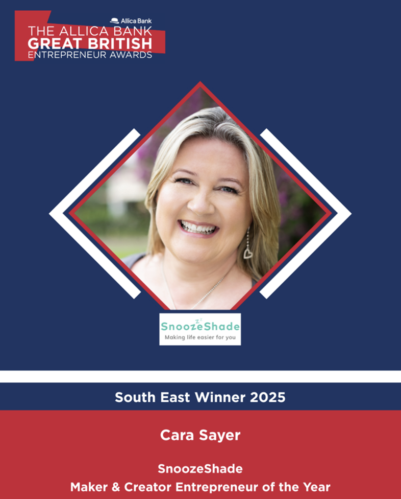 Cara Sayer, inventor of SnoozeShade and its Chief Sleep Officer, has been awarded the Maker & Creator Entrepreneur of the Year for the South East region, in the 2025 Allica Bank Great British Entrepreneur Awards. Up against thousands of entrants Cara stood out for her courage, ingenuity and results – it’s a win she is incredibly proud of.